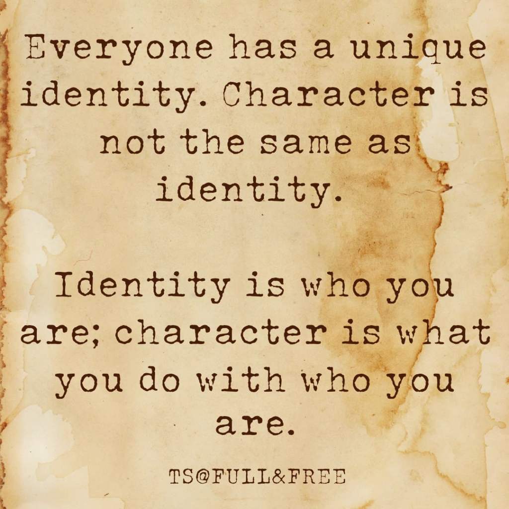Never be ashamed of your identity, there’s no fault whatsoever with it. Some mix up identity with character and think that identity brings shame or honor. Having a unique identity is never a crime. As a matter of fact, a hate crime is attacking the identities of others. Never let anyone rob you of your freedom because if God thought everyone should be the same, He would have made it so from the beginning neither did He include it as a commandment or requirements for righteousness. You can correct character but you can’t correct identity. Character is what you do with who you are.